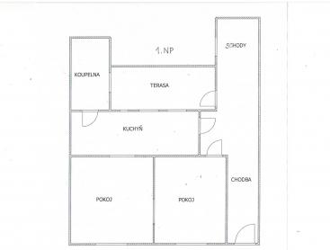 1.NP - 2+1, 52 m2. V obytných pokojích plovoucí podlaha, v kuchyni lino, okna původní dřevěná.