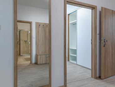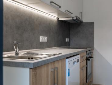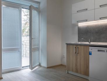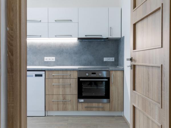 Nová kuchyňská linka obsahuje indukční varnou desku, elektrickou troubu, myčku na nádobí, odsavač par. Neprůchozí obytné pokoje jsou světlé, prostorné, s orientací na jih a západ. V ložnici je zabudovaná vestavná skříň.